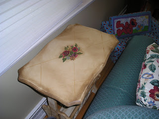 Or this side table. The cream color and flowers looked too bright to me for the space. Or this Tuscan Chair. I’ve used the technique on paint and wall paper, as well as decoupaged fabric. It’s a great companion to crackle medium too because it gets in all the little cracks and crevasses and really sends a item back in time. One thing is, you do have to work really fast, because besides being a medium, glaze is a paint extender and gives you more open working time. So why not just use glaze? Because sometimes you just don’t have any. Mix 4 parts Burnt Umber craft paint with 1/2 part plain water, till it’s like pancake batter.