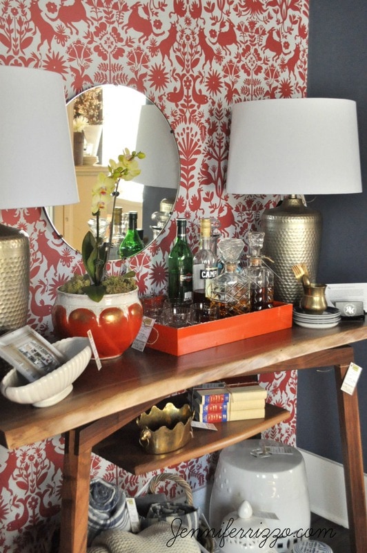 Fun wall paper behind a handmade bar