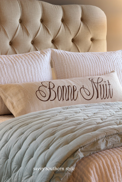 This gorgeous bedroom refresh at Saavy southern style uses soft linens and tufting to create a soft and welcoming bed with layers of quilts.